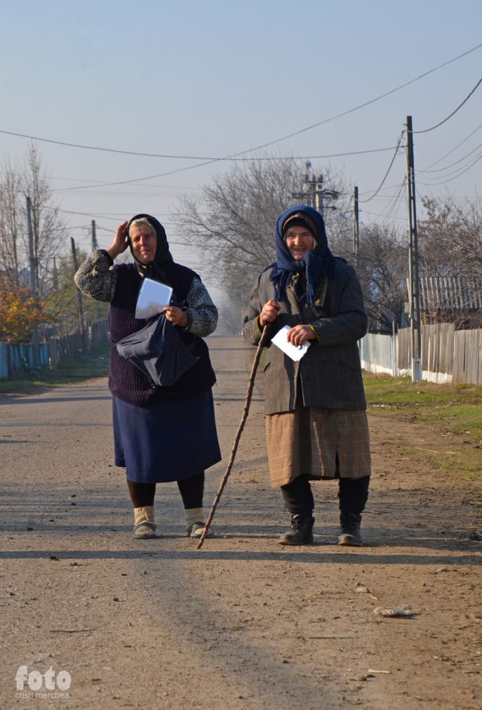 Pe ulițele satului doar bătrâni. Dacă am găsit 5-6 tineri și ceva copii care ies de la școală. În rest numai ei, singuri, cu câte o pâine de 90 de bani în mână, slăbiți, în baston, părăsiți de copii și nepoți din cauza nevoilor. Două bunicuțe înfofolite le întâlnim stând de vorbă despre nevoi și bătrânețe. Case abandonate, case ruinate, construcții noi ale celor plecați dar nelocuite, niște cimenturi hidoase împopoțonate cu termopane cu oglinzi bombate, wc-uri la stradă sau mai în spatele caselor, ca niște totemuri care ne diferențiază și ne personalizează satele noastre de azi… Căsuțele vechi se duc, stau într-o rână, gardurile frumos lucrate în lemn cad și ele, viile au șpalieri din fier dar nu sunt muncite (nu mai are cine), mizeria abundă prin grădini; pe marginea drumurilor e plin de gunoaie, hârtii, PET-uri, conserve, și toată bunăstarea adusă de capitalismul ultimilor ani, iar una din echipă, căreia îi reproșez că a aruncat hârtiile pe jos, îmi răspunde că era un calendar al PSD cel aruncat. Ca și cum asta ar justifica gestul mizerabil cu un alt mizerabil.