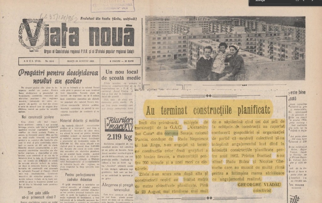 28 august 1962, „Viața nouă” din Galați anunță, prin vocea unui sovejan (Gheorghe Vlădău), că grajdurile de vaci ale GAC „Al. I. Cuza” au fost construite înainte de termen și că oameni de nădejde, meseriași sovejeni, fuseseră cei care puseseră umărul. Apar nume cunoscute nouă, celor de azi: Radu Negoiescu, Ion Jinga, Radu Bulea, Neculae…