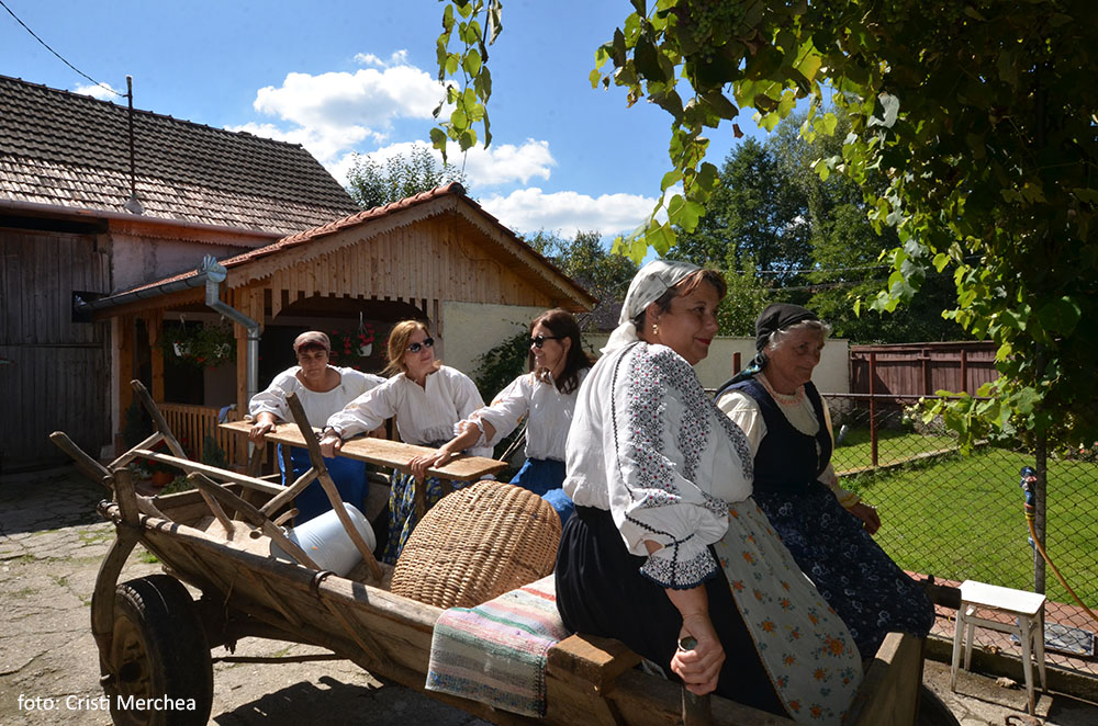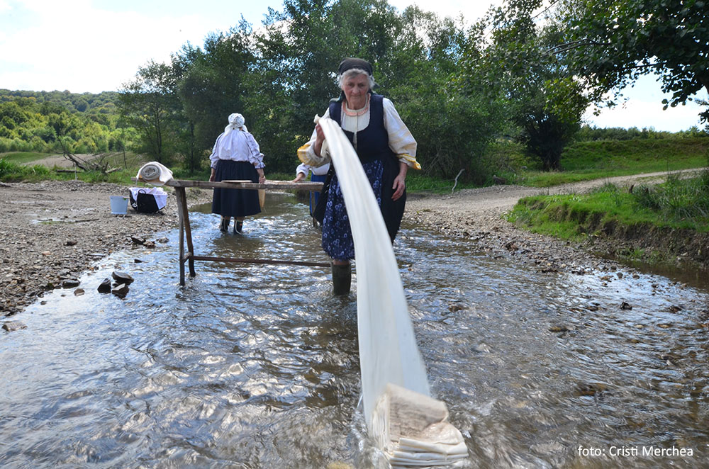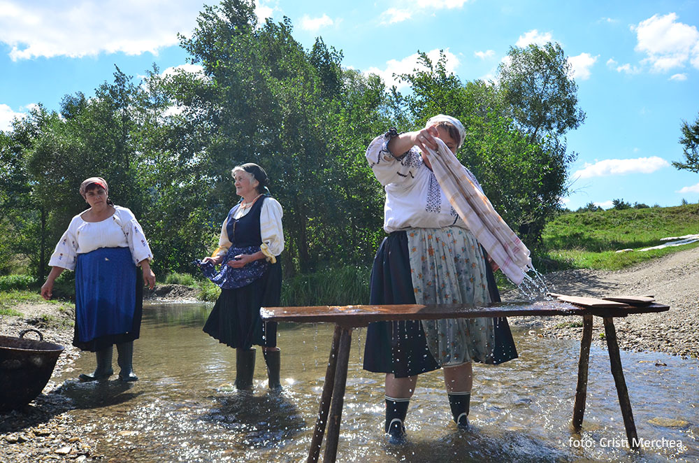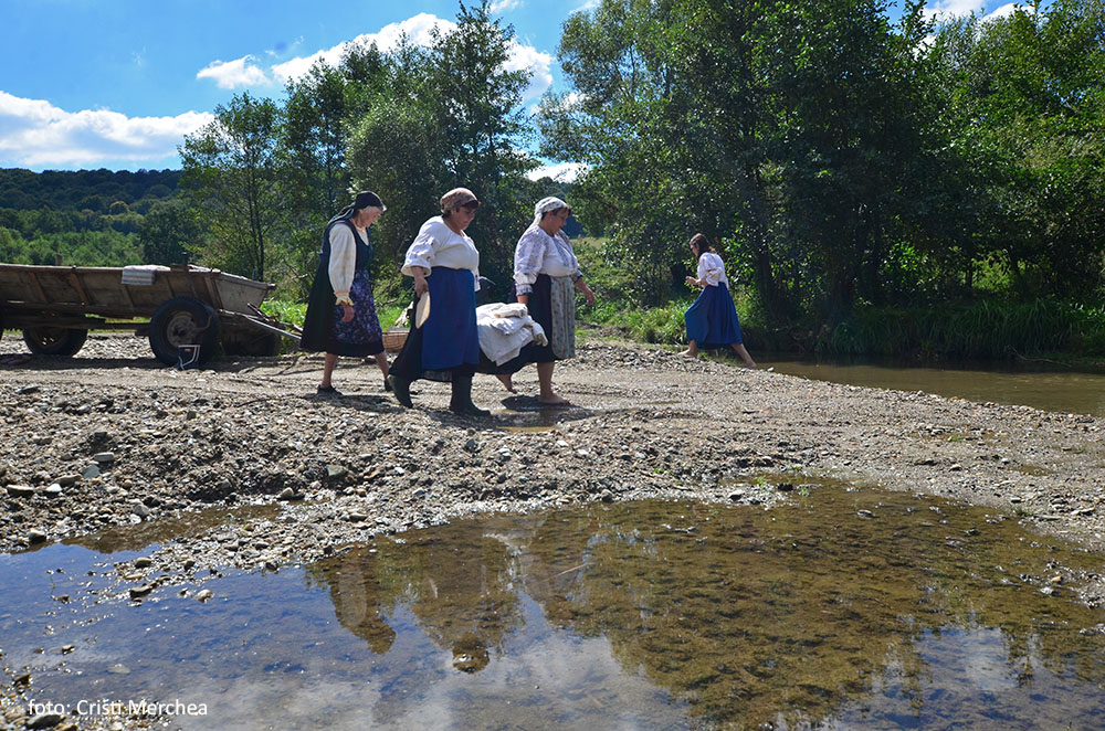 Pâinile coapte sunt puse într-o covată și acoperite cu un ștergar alb. Acum fetele se pregătesc să ducă rufele la râu, la înălbit. Odată aveau cal, dar astăzi căruța va fi trasă de un tractor. Se molipsesc și alte femei venite de departe și vor și ele să fie în costume populare. Așa că Maria le ia în casă și le îmbracă.