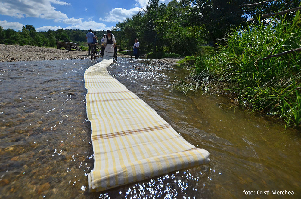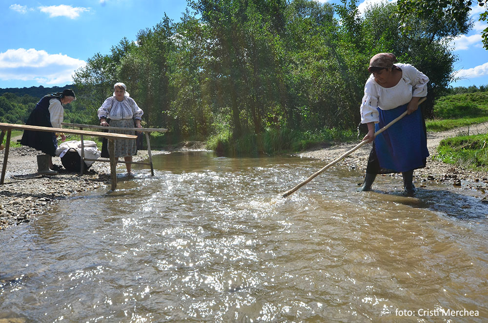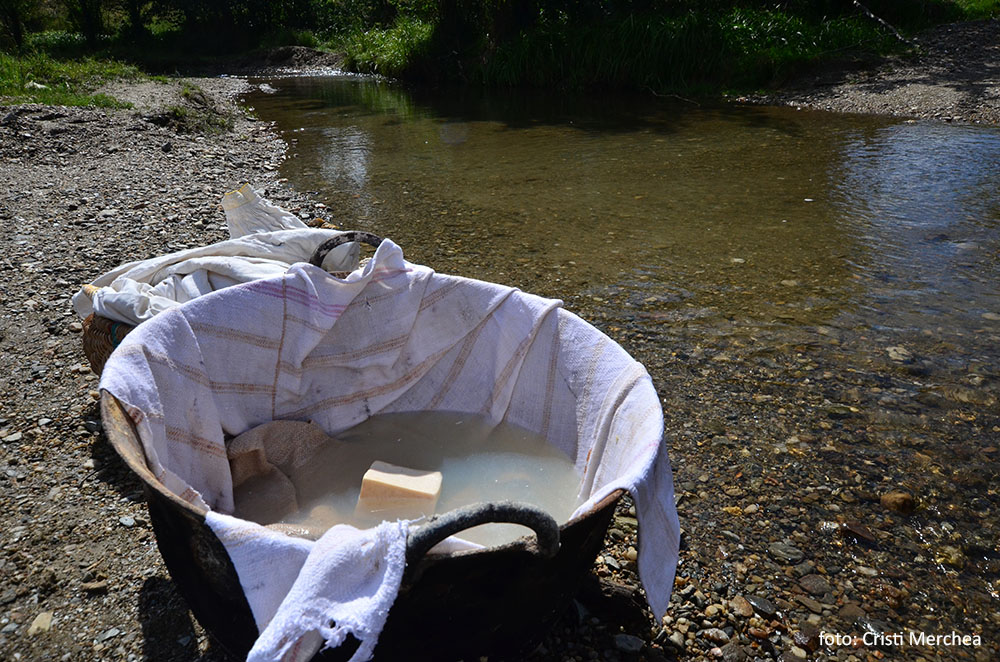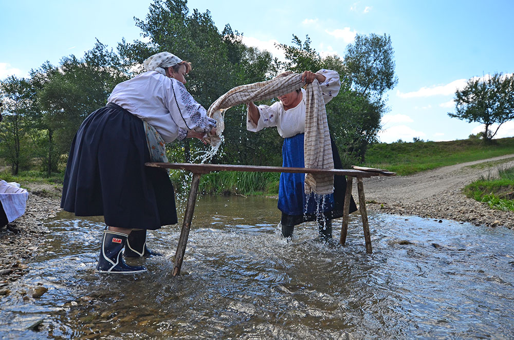 Cu două sape, femeile trag pietrele din locul unde vor spăla albiturile. Două scaune lungi, aduse cu căruța, sunt înfipte în albia râului. Valuri de stofă sunt aruncate ca niște furtune de pompieri, desfășurându-se grațios pe lungimea apei, planând și căzând apoi ca niște panglici. Apoi sunt trase înapoi pe picior, împăturite, puse pe scaune și bătute cu maiurile. Și dau fetele cu sete pentru că fără forță nici curate nu vor ieși.