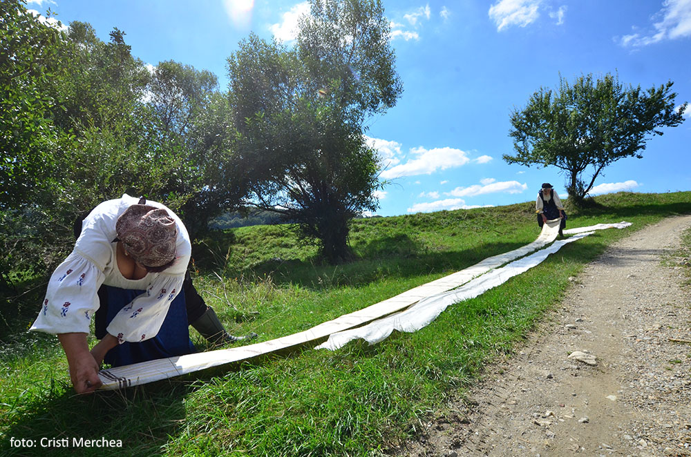 La capătul fâșiilor lungi de pânză albă, uscată la soare, femeile s-au așezat sub umbra unui arin. Sticla de rachiu rece e scoasă alături de chiuituri și cântece cum numai ele știu a spune cu voci pline de voioșie și bucurie.