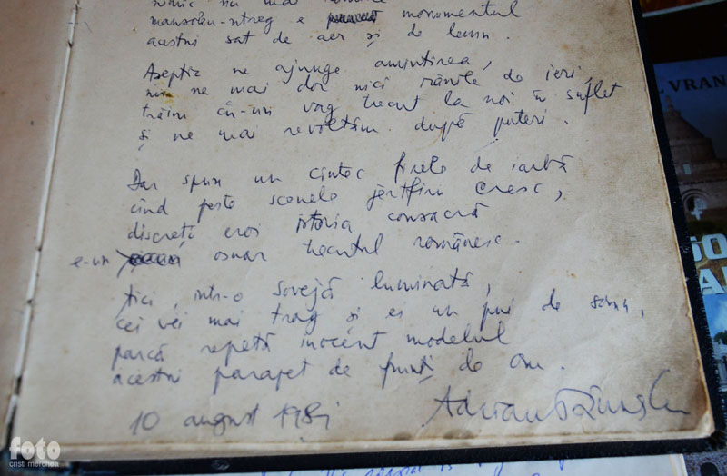 Poate fi lugrubu sau fioros pentru unii, dar în vacanța sa din 1981, poetul Adrian Păunescu s-a așăzat pe zidul de afară și, la invitația custodelui de atunci, Ion Băra, a scris câteva versuri memorabile pentru sovejeni, dar și mai memorabile pentru eroii neamului și condiția acestora. Vi le prezentăm în manuscrisul original al poetului aflat în Cartea de Onoare a mausoleului.