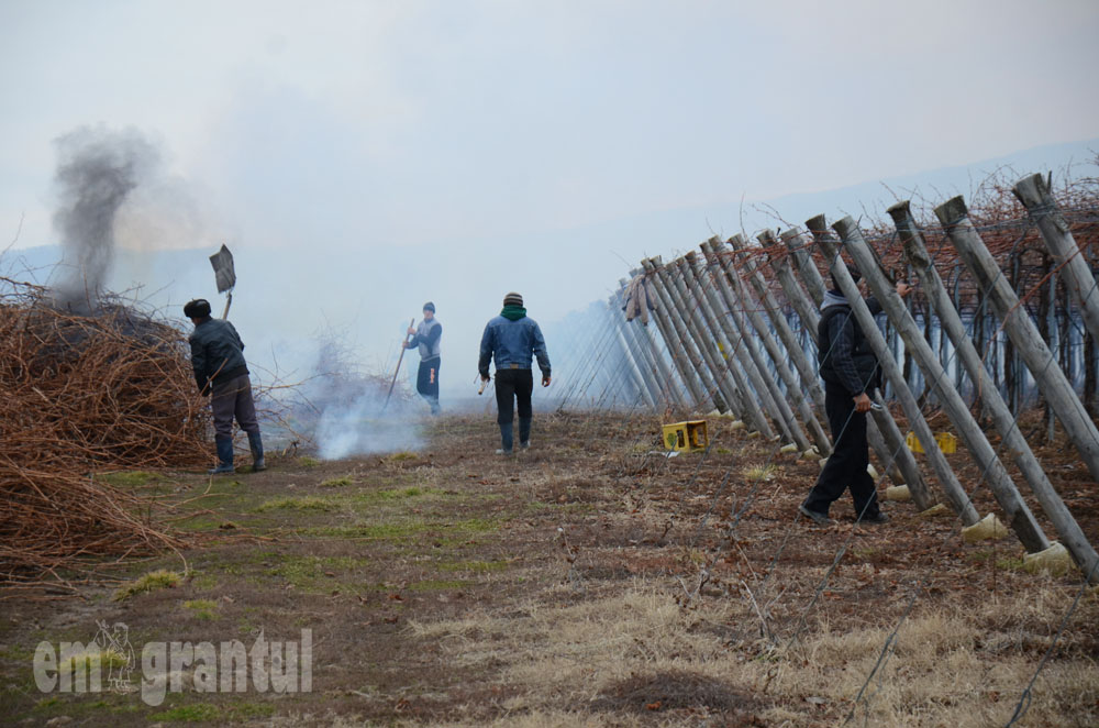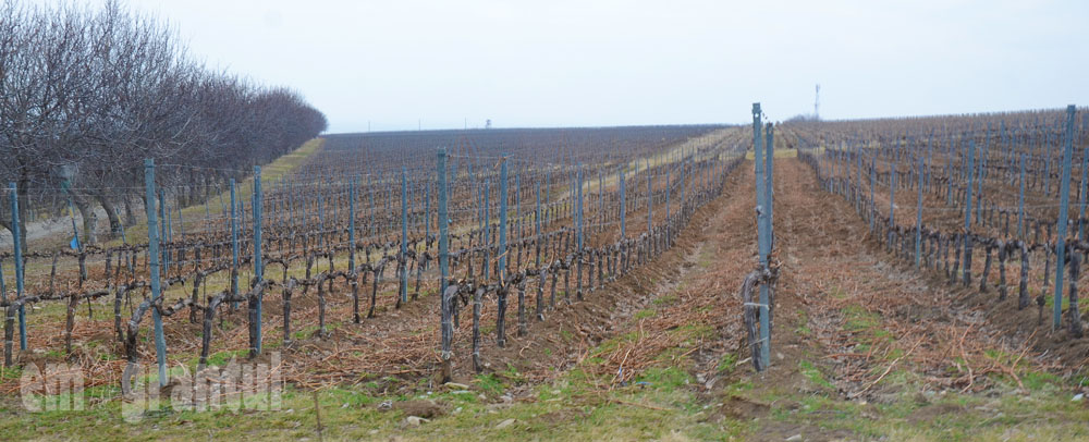 Vizităm întinderile cât vezi cu ochiul ale viței-de-vie plantate de această fermă. Peste 50 de oameni sunt la tăiat, legat, curățat terenurile. Oameni veniți de prin toată Moldova pentru că în sat nu mai sunt apți de muncă decât puțini. Pe timpul culesului ei ajung și la 300, toți cazați în structuri construite special pentru asta.