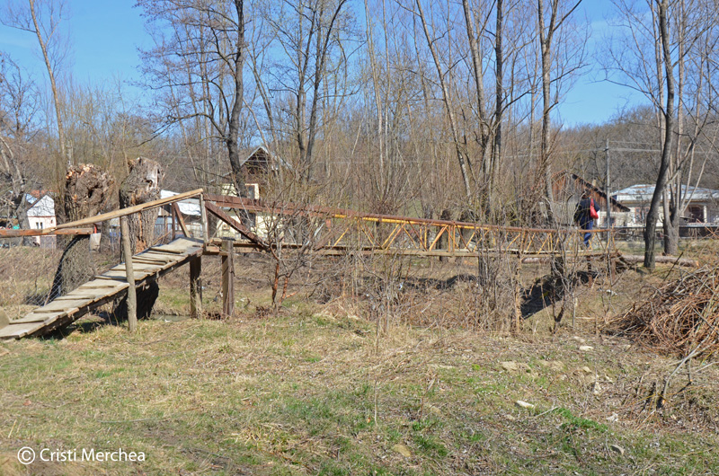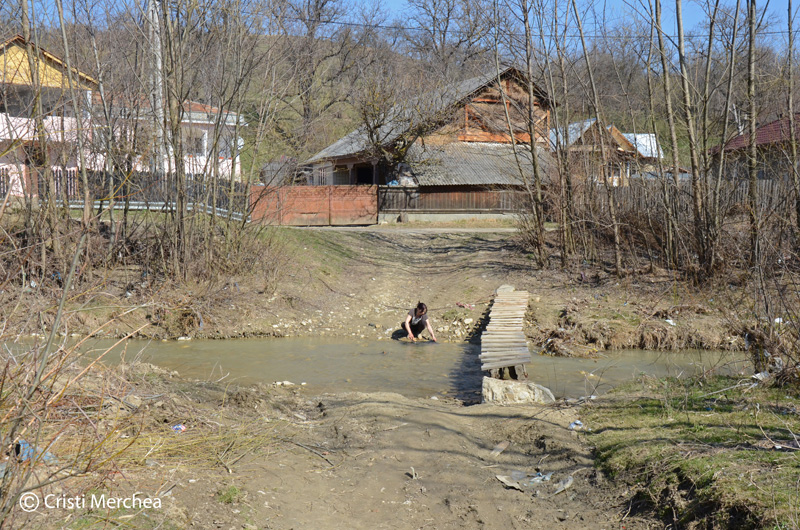 Drumul până aici e sinuos și plăcut. Fuioare de fum se ridică ici-colo printre case și prin grădini. Trec apa pe o punte și mă opresc să fotografiez. O femeie tocmai vine să spele în albie niște preșuri de mașină.
