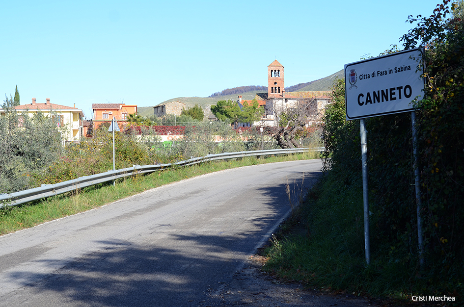După mai multe curbe în urcuș, pe vârful unui deal se vede clopotnița în stil romanic a unei biserici. Ne apropiem și, – pe stânga o vale plină de măslini, în drapta un deal, la fel, îmbrăcat în livezi cu aceste pante seculare cu tulpini groase, uitate de vreme – un indicator ne arată și numele comunei: Canneto.