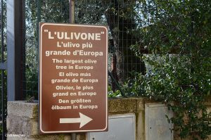 Un panou maro, așa cum sunt toate cele care indică sau informează despre locurile istorice, ne spune că aici se află cel mai mare măslin din Europa: l’ulivone (măslinoiul – cum îl chamă localnicii). Nici un kilometru și, la intrarea în sat, trei localnici, deși e duminică, scutură un măslin chiar în stradă. Ne oprim, întrebăm și aflăm: