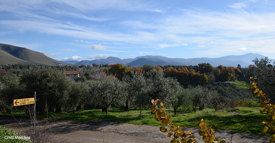 De la Passo Corese, o intersecție care desparte partea de jos a Sabinei, virăm stânga spre Fara in Sabina. Stejari aurii imenși răsar în drum, ici și colo, colorând peisajul încă verde crut cu ruginiul lor intens. Pentru că în această zonă, deși urcăm spre munte, decembrie e verde iar marginea drumului plină de urzici, Floarea Paștelui (care la noi iese primăvara), portocali, și, bineînțeles, măslini. Ne oprim și culegm și noi câteva mâini de măsline care nu sunt bune așa, crude, dar puse la murat vor deveni comestibile.