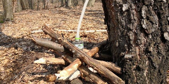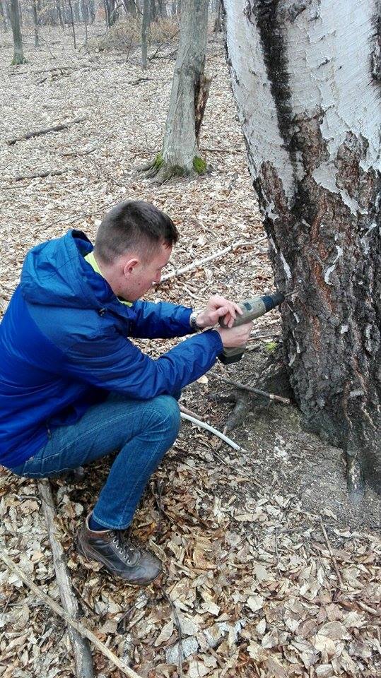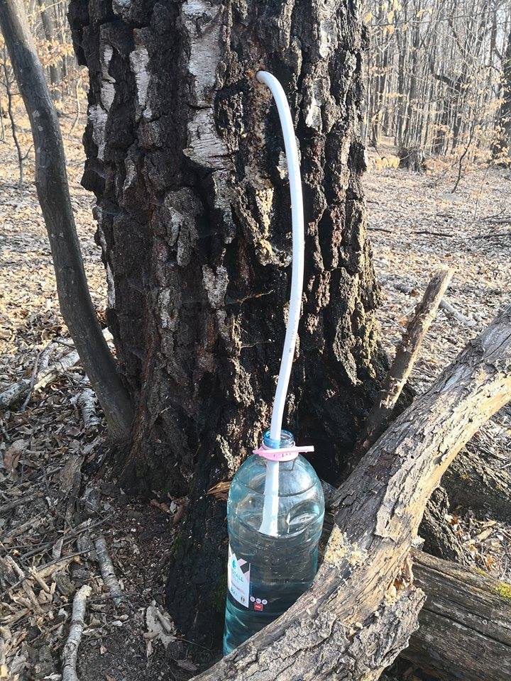 olectarea sucului de mesteacăn se face prin metode simple, printr-un tub care duce seva către un recipient.