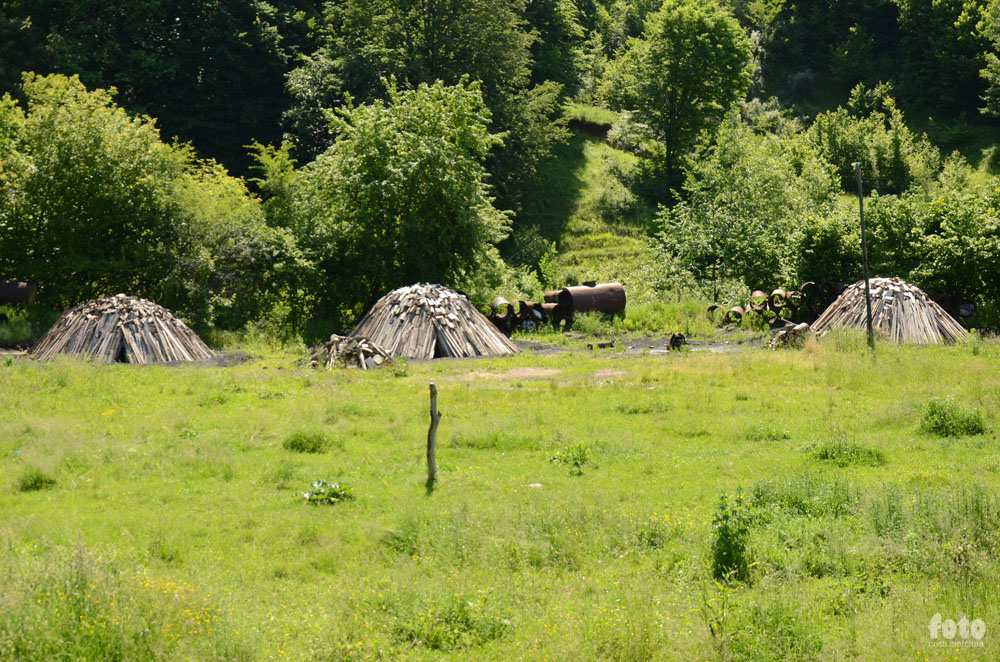 Într-o vale, după ce trecem un podeț, câteva movile de lemne ne arată că cineva mai face cărbuni așa cum se făcea odată. Nu se lucrează acum fiind duminică și nici proprietarul nu se află pentru că doi dulăi vin hotărâți să ne confirme absența sa.