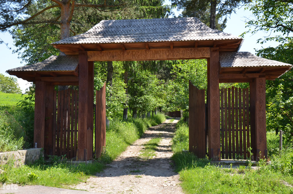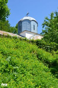 O cărăruie urcă prin iarbă, sub streașina brazilor, pinilor și prunilor, spre „fosta” Mănăstire Vizantea. Nu urcăm pe ea pentru că ni se pare o cale de acces mai intimă, mai a celor de aici. Așa că, la câțiva metri mai sus, o alee largă, cu o poartă monumentală în capăt, ne conduce spre biserică. Drumul e o desfătare de miresme și triluri, de zumzete și răcoare. O stâncă mare iese din iarbă înaintea porții bisericii iar turla clopotniței se înalță maiestuoasă din zidurile vechi ale Mănăstirii. Nu e nimeni și deschidem cu grijă poarta din lemn. O doamnă își face apariția. E preotasea, credem, care ne invită să vizităm lăcașul.