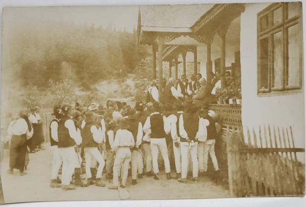 O fotografie de epocă în care, dincolo de eveniment, se remarcă frumusețea arhitecturii caselor mocanilor din Soveja și a hainelor pe care le purtau vara.