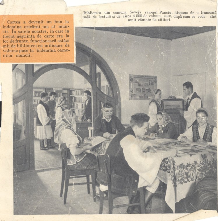 O imagine cu siguranță „aranjată”, dar edificatoare. Pentru că în ea se văd chipurile mocanilor așa cum erau la acea vreme, în frumoasele lor costume populare, preocupați să citească pentru fotograf, care trebuia să suprindă gradul de evoluție intelectuală și, de ce nu, de binefacere, pe care partidul o crea pentru cei de la țară. Inclusiv cu noua tehnologie, radioul, prezent în cel de-al doilea plan.
